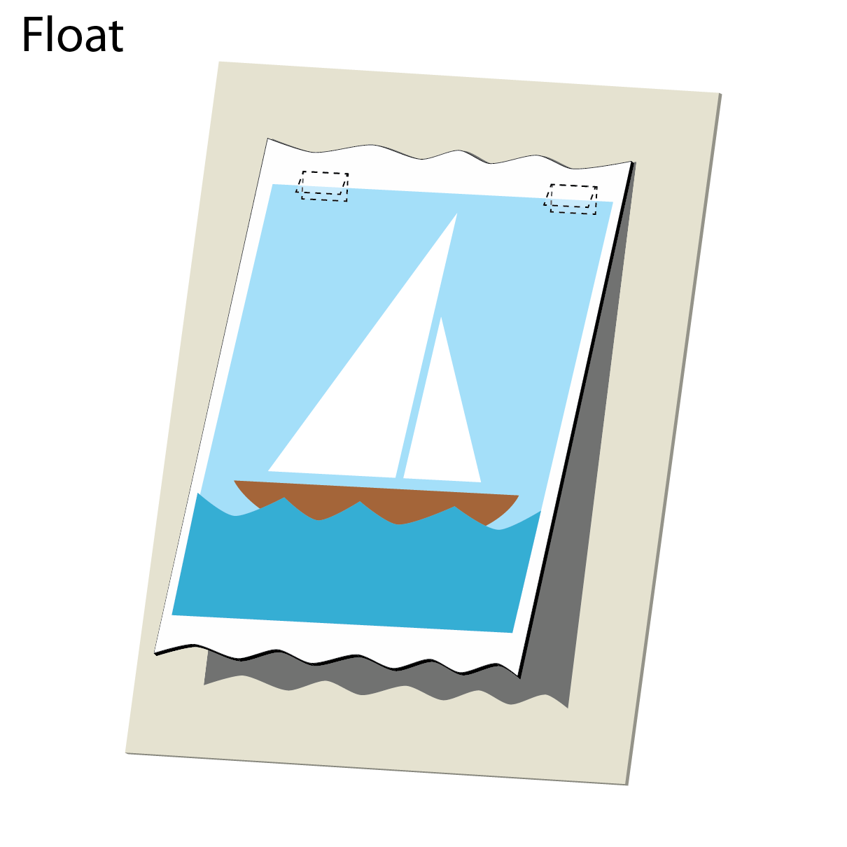 A float mount displays the artwork on top of an uncut mat, allowing all four edges of the art to be visible, creating a "floating" effect. Small pieces of archival hinging tape are hidden behind the artwork to secure it, with extra tape added for fragile pieces. We recommend using acrylic spacers to prevent the glass from touching the float-mounted artwork.